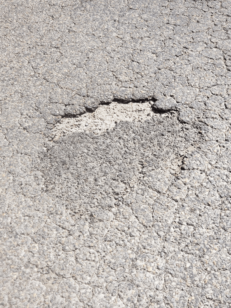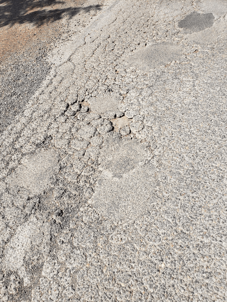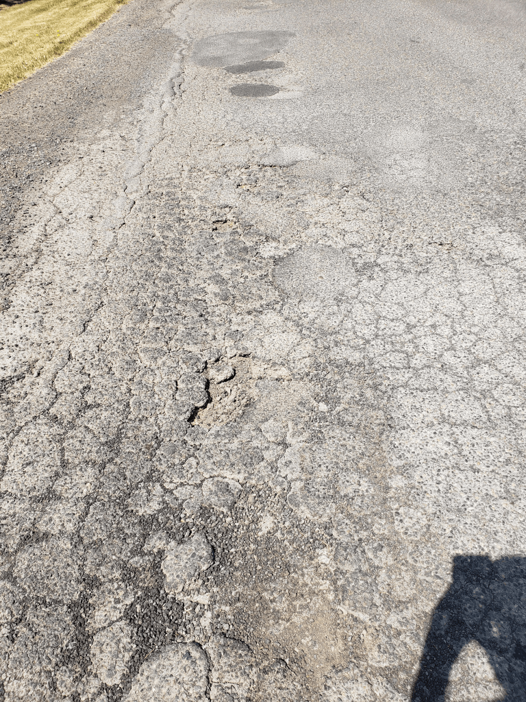 Widespread asphalt deterioration. Its been like this many years Pothole patching no longer effective Advanced alligator cracking. The roadbed is shot. Note the thin asphalt over a poor roadbed.