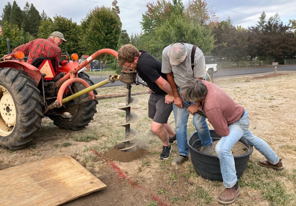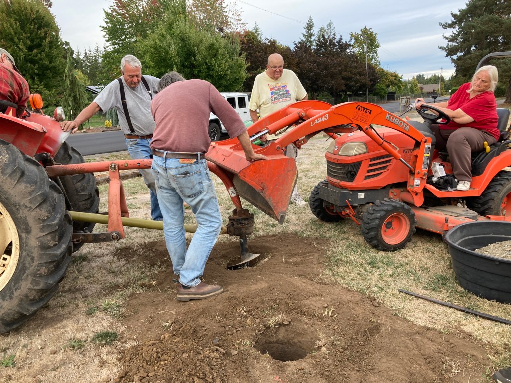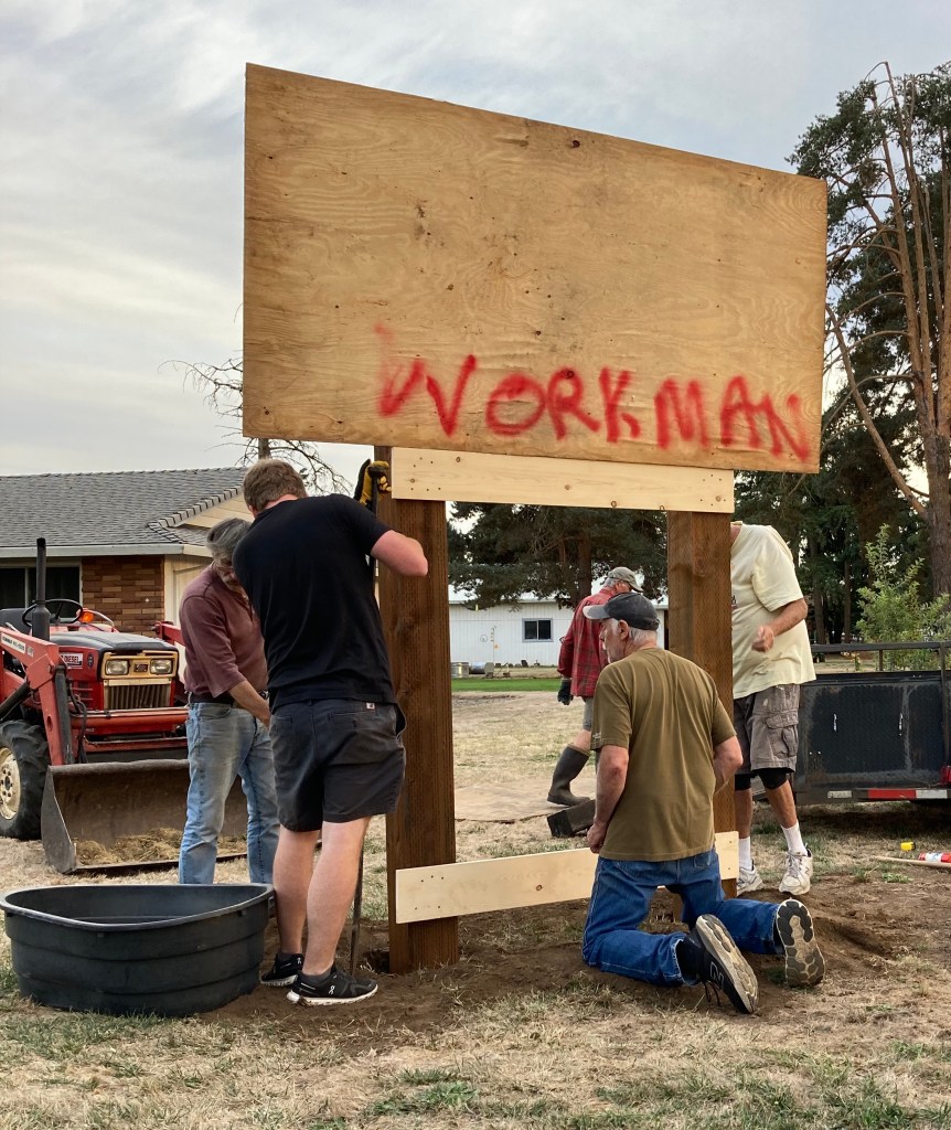 Thank Randy Zapp for sourcing the auger and for his tractor handling skills. Jeff Wright, Dwight Smith, Daily Holman, Brian Hickman, and Bruce Harding added muscles, brains, and brawn.Sharon Johnson showed off her machine’s capabilities by steadying the augerSharon Johnson carefully maneuvering the sign support.It took some wrestling, a little persuasion, and maybe a few new vocabulary words, but Jeff and Bruce finally coaxed the signpost into the hole.”There it is—standing tall and looking good! Though our new friend “Workman” clearly needs a crash course in font design. Stay tuned for upgrades.